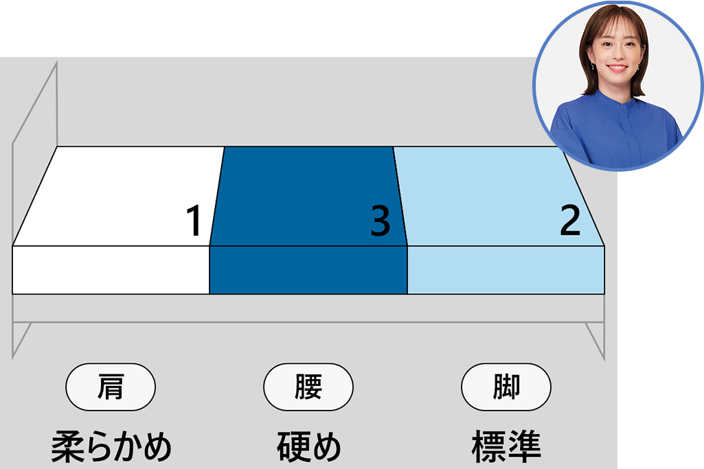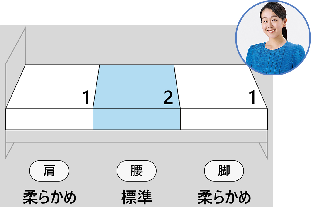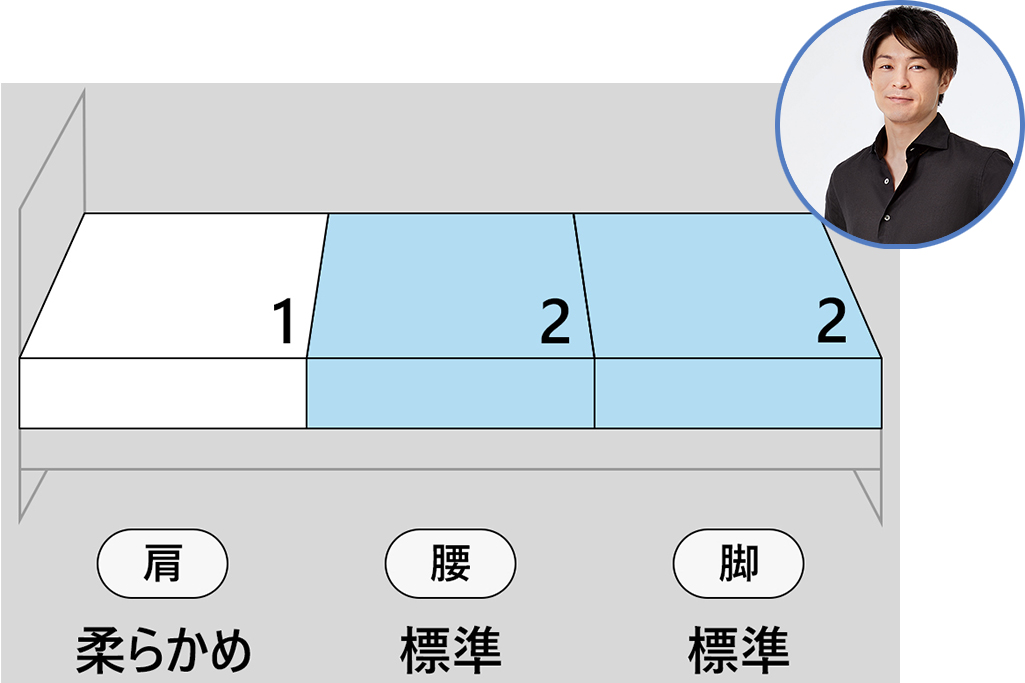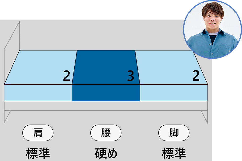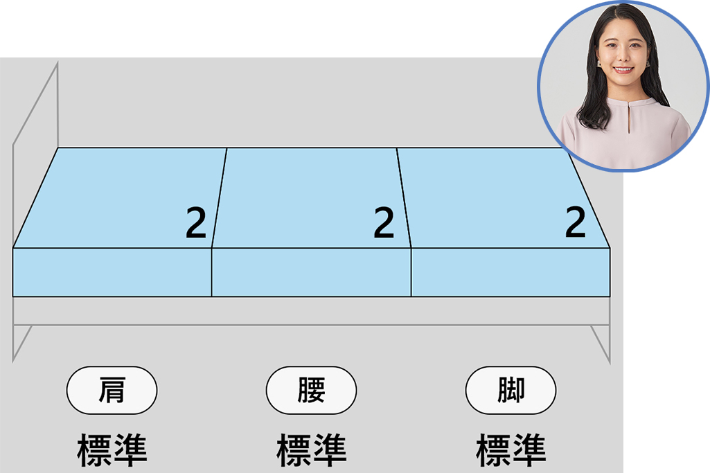 エアウィーヴでは大きく負荷がかかる部位(肩・腰・脚)ごとに、異なる硬さで身体を支える、一人一人に「最適な寝具」を提供しています。部位ごとの硬さのパターンとしては以下などがあります。